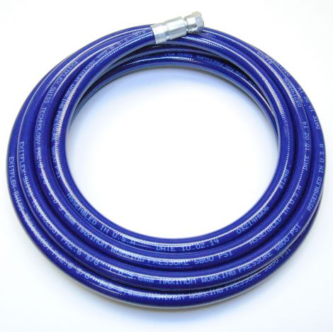 The most commonly used 3/8” airless paint sprayer hose is our 5,800 PSI high pressure hose. With fluid mechanics in mind, this high pressure hose is constructed with a double wire of carbon steel which provides its great strength. The wire braiding ensures 100% electrical conductivity throughout the airless paint sprayer hose which is ideal for industrial spray painting. In addition, we offer custom high pressure hose assemblies that will solve your fluid dynamics needs and allow you to be most effective with your finishing equipment.